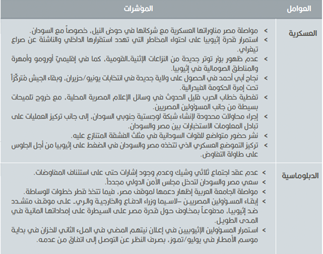 ورغم تفوق قدرات مصر الهائل إلا أنها ستواجه عقبات كبيرة في شن أي عمل عسكري، سواء كان يهدف لإخافة الإثيوبيين أو إلحاق ضرر جسيم بمشروع السد. كما أنَّ هناك عقبة أخرى أمام الخيار العسكري المصري بسبب بعد المسافة الجغرافية بين البلدين، وبما أنَّ مصر لم تستثمر في أي شكل من أشكال قدرات التزود بالوقود في الجو، فإنَّ إثيوبيا تقع خارج نطاق القتال لكافة الطائرات المصرية التي تقلع من مطارات مصرية. العزاء الوحيد لمصر هو أنَّ السد قريب جداً من الحدود السودانية. وسيؤدي الحصول على إمكانية استخدام المطارات السودانية إلى وضع السد في مدى جزء من سلاح الجو المصري. لكنَّ العمل من الأراضي السودانية قد يكون معقداً من الناحية السياسية، وستكون له تداعيات دولية على السودان فضلاً عن مصر. كما أنَّ قرب السودان من إثيوبيا سيجعله عرضة لانتقام عسكري مباشر. والأرجح أن يكون الهدف من أي هجوم عسكري هو إجبار إثيوبيا على إبرام اتفاق ملزم لضمان حصص مائية كافية وتفاهمات لإمداد الطاقة لمصر والسودان. وتمر إثيوبيا أيضا بانتقال ديمقراطي حساس، وهي تعاني مع العنف العرقي المتزايد داخلياً بينما تحارب الجائحة. وفي ظل عودة مصر إلى استقرار سياسي أكبر عقب سنوات اضطراب عديدة، لن يرغب الرئيس السيسي في تعريض موقف النظام في المفاوضات للخطر من خلال الدخول في حرب مع إثيوبيا.