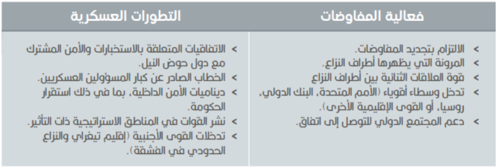 السيناريو الأقل احتمالا. ما يزال الحل الدبلوماسي من خلال مباحثات مباشرة أو مفاوضات أو وساطة من جانب طرف ثالث هو أكثر سبيل تسعى من ورائه الأطراف لوقف النزاع، ولو أنّ السعي لإيجاد وسيط “محايد” أو مفاوضات ثلاثية تضم السودان ومصر وإثيوبيا يبقى بعيد المنال. ورغم صعوبة الأوضاع، تحقق الكثير من التقدم في المفاوضات. إذ اتفقت الأطراف على الكيفية التي ينبغي أن تملأ إثيوبيا بها السد، وكمية المياه التي ستسمح بوصولها حين يكون معدل سقوط الأمطار كافياً. ووافقت إثيوبيا أيضاً على ضخ كميات محددة سلفاً من المياه، بحسب منسوب السد والتدفق من النيل الأزرق إلى الخزان، حتى في سنوات الجفاف.