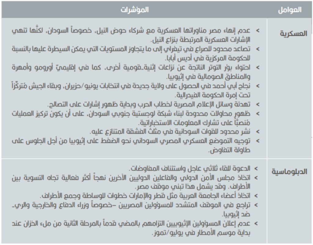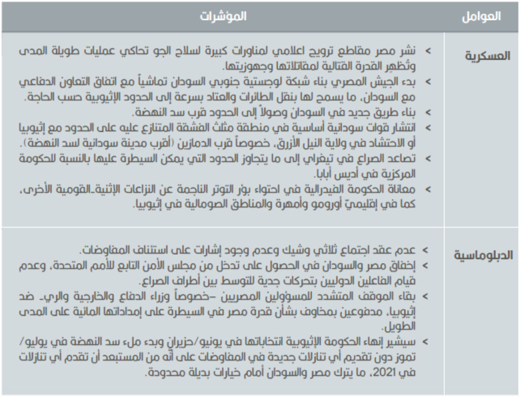 وقد تدعم مصر وترعى تجدد الصراعات الإثنية-القومية المسلحة في إقليميّ أورومو وأمهرة والمناطق الصومالية في إثيوبيا، بهدف فرض ضغوط على الحكومة الإثيوبية. ومن المحتمل أن يؤدي التصعيد في المنطقة الصومالية في إثيوبيا إلى توتر العلاقات الصومالية الإثيوبية وتعقيد جهود مكافحة “الإرهاب” الإثيوبية في الصومال. علاوة على ذلك، قد تُحرِّض القاهرة المعارضة السياسية في إقليم تيغراي ضد حكومة آبي أحمد بسبب ما يُنظَر إليه باعتباره “تشريداً وعدم اكتراث” للحساسيات في تيغراي. وربما تستغل مصر أيضاً النزاعات الحدودية بين إثيوبيا وإرتريا، وقد تسعى مصر لعزل إثيوبيا في منطقة القرن الإفريقي من خلال الجامعة العربية، بتأليب الشمال العربي وأعضاء الجامعة العربية الآخرين مثل الصومال وجيبوتي، ضد إثيوبيا. وإذا ما فشلت هذه التوجهات، قد تفكر مصر في نشر قوات خاصة للقيام بعمليات سرية عميقة لمهاجمة السد مباشرةً.
