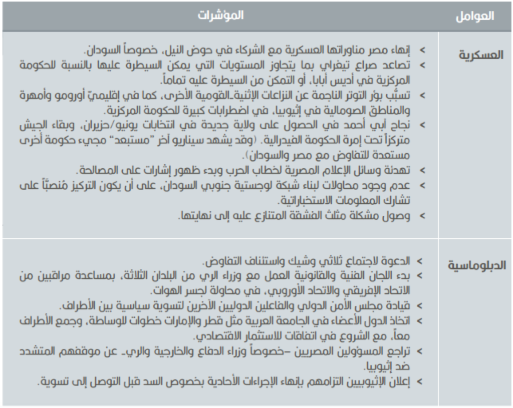 وقد يؤدي هذا إلى تراجع إثيوبيا وتقرير تأجيل الملء الثاني للسد. ويمكن أن تُقدِّر أديس أبابا أنَّ القوى النافذة قد بدأت تُولي النزاع أولوية في حساباتها، بسبب الخوف من وقوع اشتباكات بين مصر والسودان وإثيوبيا. وسيكون الفاعلون الدوليون حذرون من التأثير المدمر للصراع، في حال وقوعه، على مناطق القرن الإفريقي وشرق إفريقيا والعالم العربي والبحر المتوسط والاتحاد الأوروبي.
