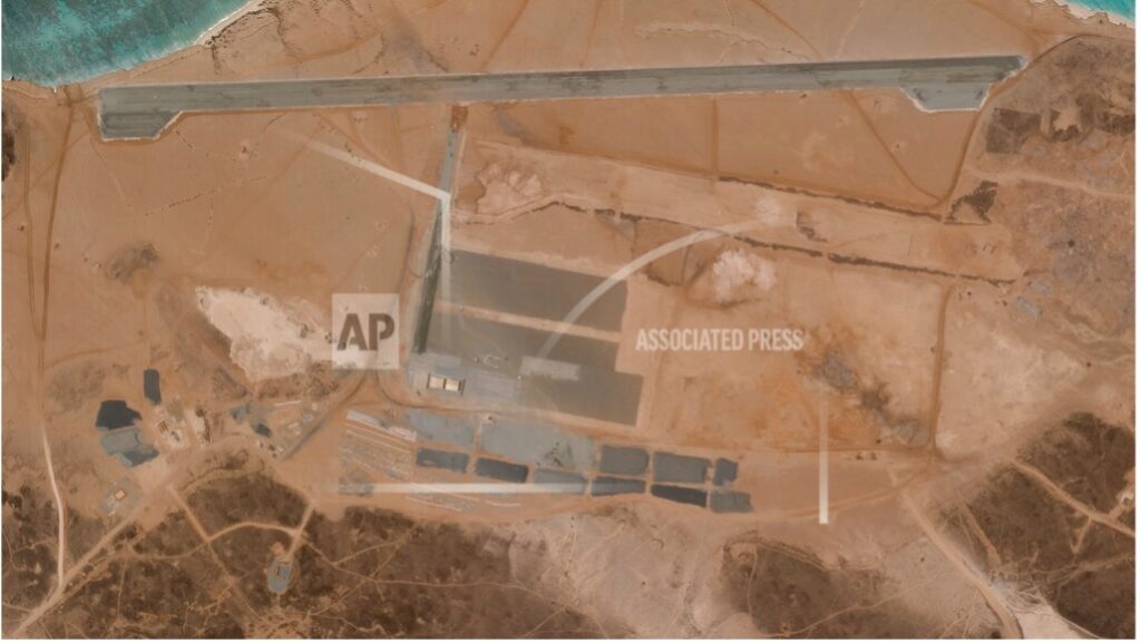 صورة الأقمار الصناعية لمدرج الطائرات والمنشآت الجارية في القاعدة الجوية في جزيرة بريم. المصدر: وكالة أسوشيتد برس