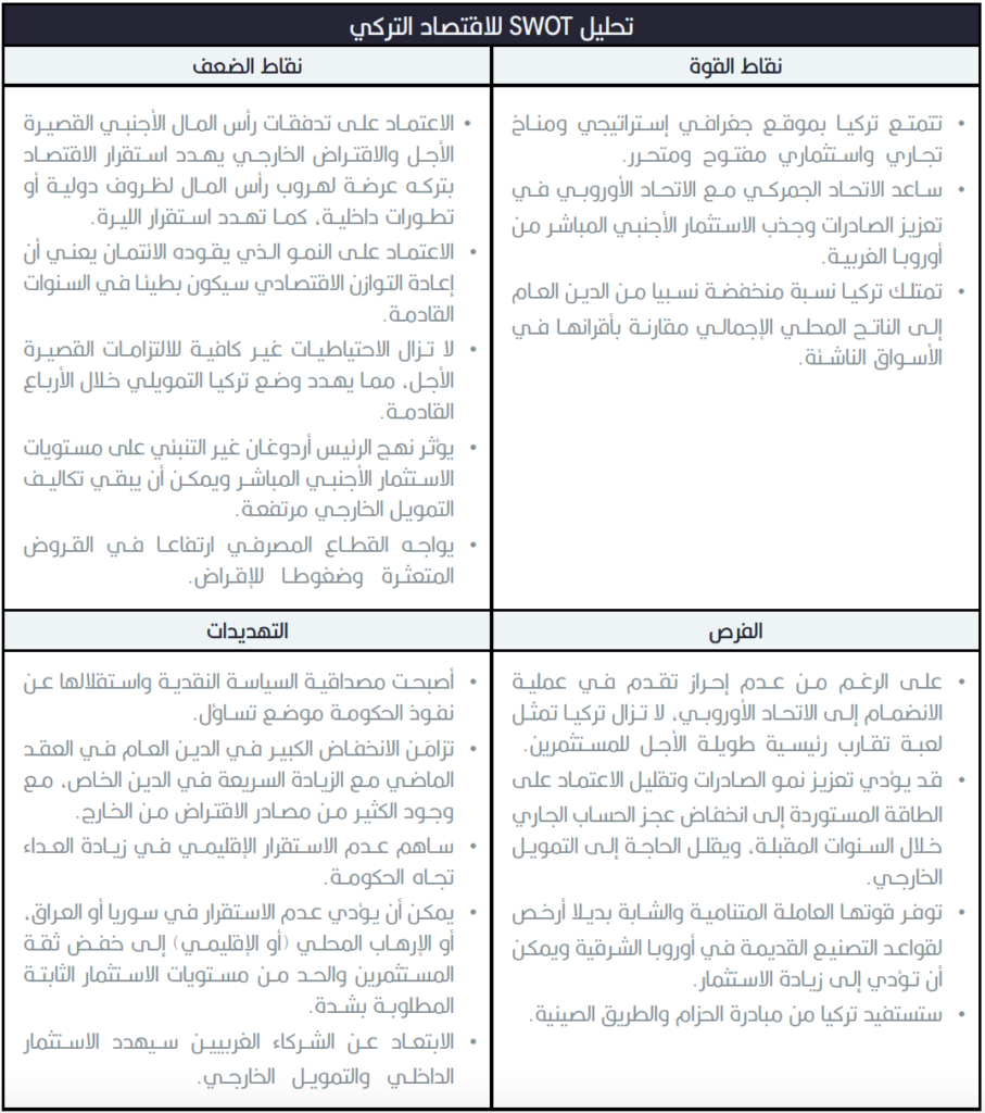 - التوقعات المضطربة القصيرة الأجل قد تضطر الحكومة التركية إلى المضي قدما في إصلاحات هيكلية، ومن شأن هذه الإصلاحات أن تحرر تركيا من الاعتماد على الواردات، وتحسين كفاءة التصنيع، وتقليل الاعتماد على الطاقة المستوردة، وتشجيع تدفقات أقوى للاستثمار الأجنبي المباشر. ومع ذلك، وبافتراض أن الحكومة التركية تعمل على استقرار الاقتصاد وجذب شركاء أجانب على المدى المتوسط، فإن إجراء بعض هذه الإصلاحات الهيكلية سيساعد في إعادة بناء الثقة الدولية. لكن ليس من المرجح أن يكون العمل مع صندوق النقد الدولي ضمن أجندة الرئيس أردوغان.