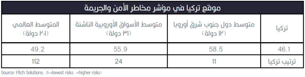 - في ضوء العوامل السابقة، تسجل تركيا 46.1 نقطة من 100 على مؤشر الجريمة والأمن الذي تعده “فيتش سوليوشنز”، وهي قيمة متراجعة مقارنة بالمتوسط العالمي أو متوسط دول شرق أوروبا أو متوسط الأسواق الناشئة.