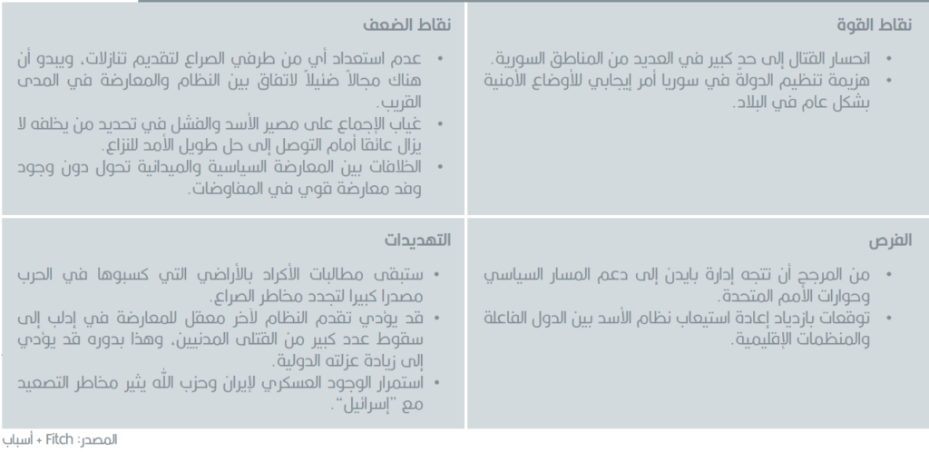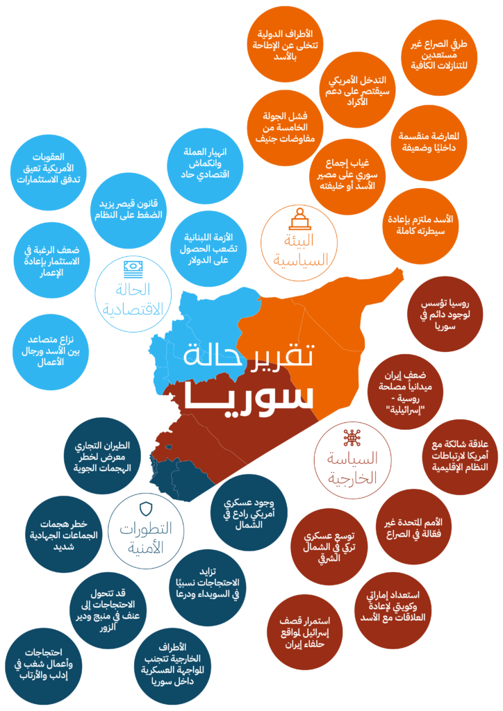 - ما زال رئيس النظام السوري بشار الأسد ملتزما بإعادة السيطرة على كل سوريا، بدعم من روسيا وإيران. وليس لدى الأسد حافز كبير لتقديم أي تنازلات ذات مغزى لما تبقى من المعارضة المسلحة المنقسمة بشدة بين الفصائل التي تدعمها تركيا وبعض المجموعات الجهادية، خاصة مع التقدم العسكري الكبير لصالح النظام، وعدم رغبة إيران وروسيا وتركيا والأردن والولايات المتحدة تفكيك هياكل الدولة في سوريا بالكامل.