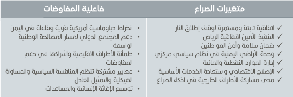 - اشراك الخليج في نهج استقرار اليمن، وكذلك إيران التي أشارت إلى أنها أكثر استعدادًا لدعم المفاوضات والمساهمة في عملية التسوية خشية تهميشها في أي صفقة.