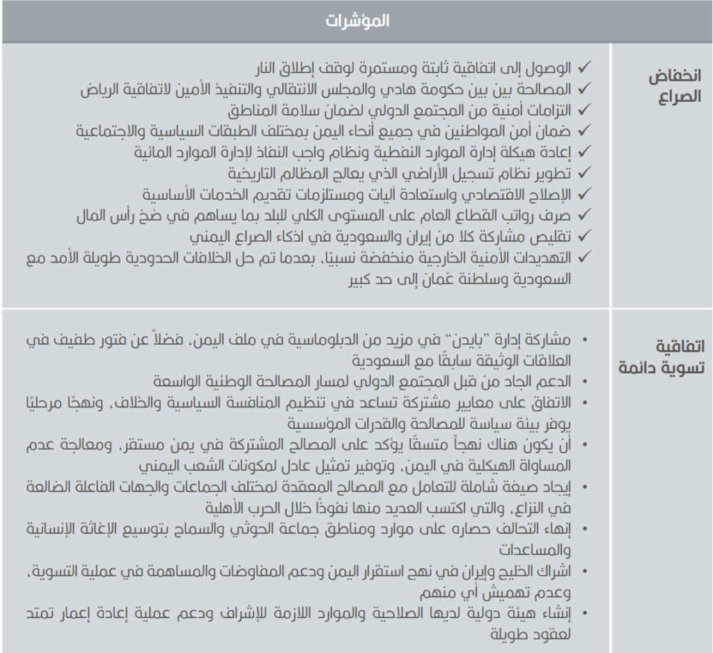 - التنفيذ الكامل والشفاف لاتفاقية الرياض بين حكومة عبد ربه منصور هادي والمجلس الانتقالي بقيادة “الزبيدي”، هو على الأرجح شرط مسبق لأي مفاوضات جادة من طرف الحكومة الشرعية مع جماعة الحوثي.