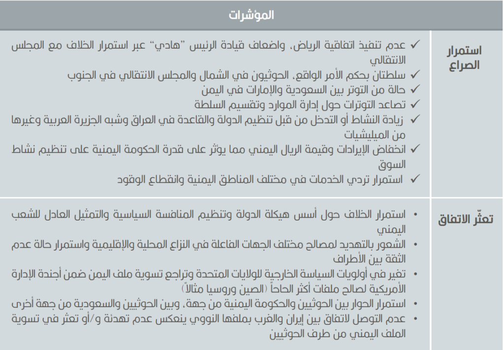 - توقع اتساع الفجوة في عملية التفاوض بين الحوثيين والفاعلين السياسيين الآخرين، وعدم الوصول لصيغ أسس مشتركة لعملية سياسية مستقبلية.