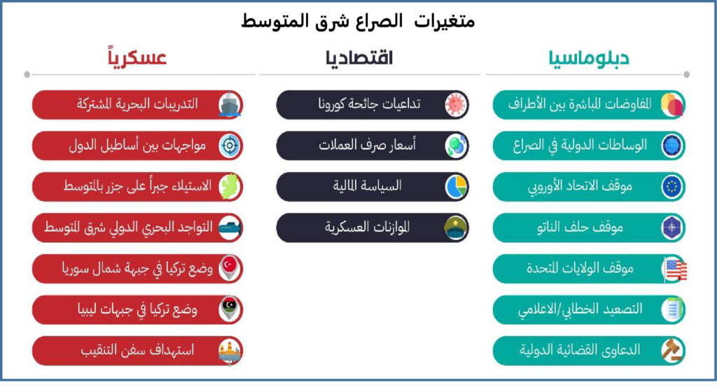 – في الجدول أدناه، نوضح المتغيرات التي سيتم بناء السيناريوهات عليها وهي في ثلاث تبويبات: متغيرات اقتصادية، دبلوماسية وعسكرية.