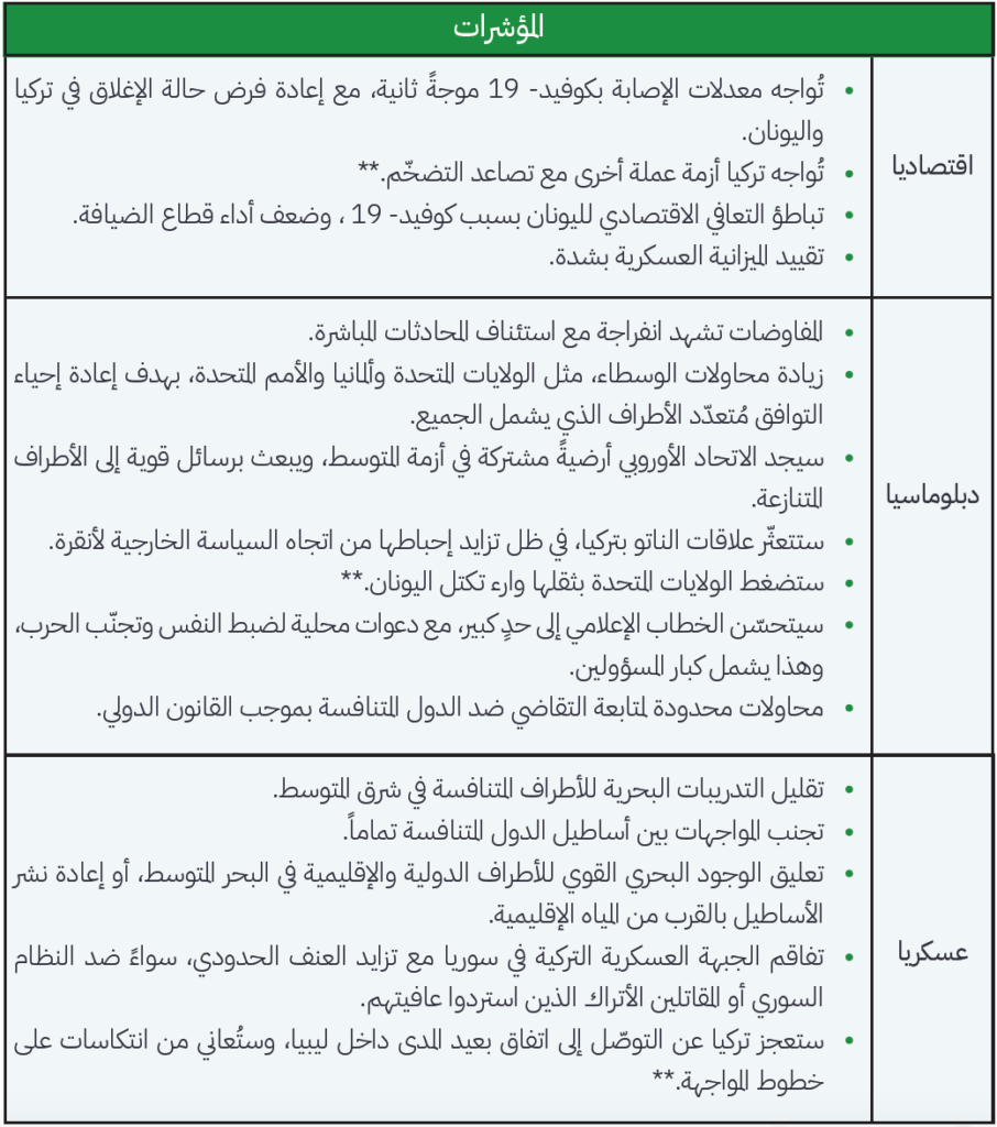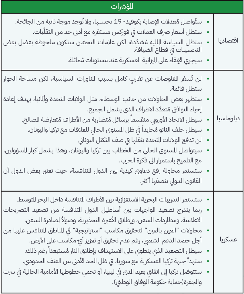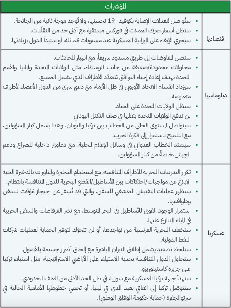 المسار الأكثر ترجيحاً على المدى القریب هو استمرار التوتّرات التي یُمكن السیطرة علیها دون اندلاع صراعٍ مباشر بین تركیا ودولمنتدى غاز شرق المتوسط. يعتمد هذا السیناریو إلى حدٍ كبیر على استمرار تطورات الوضع السیاسي الراهن، حيث أنّ الدافع المُستمرللتنقیب داخل المیاه المتنازع علیها، والوجود المتزاید للبحریة التركیة الجاهزة لاعتراض سفن تنقيب شركات النفط الدولیة، وعجز أو عدمقدرة الاتحاد الأوروبي على تحدّي تركیا هي عواملٌ اجتمعت معاً لتجعل من هذا السیناریو المسار الأكثر ترجيحاً.
