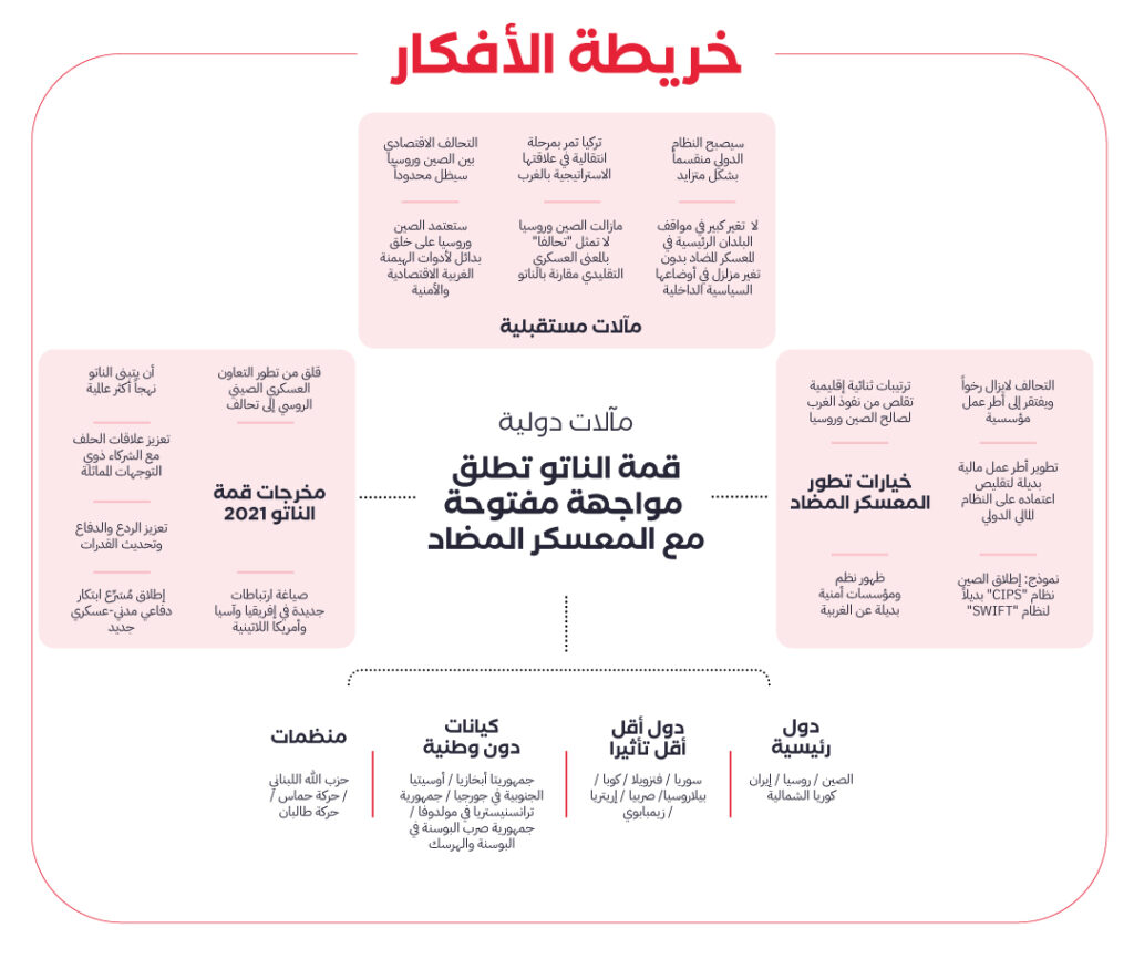 ● من المرجح أن يظل “التحالف المناهض للغرب” بقيادة الصين وروسيا قوة كبيرة في السياسة الدولية في المستقبل المنظور. لذلك، اتفق قادة حلف “الناتو” على أهمية تكاتف أوروبا وأميركا الشمالية لمواجهة روسيا والصين كأولوية خلال العقد الجاري. فبالإضافة للصعود الصيني الاقتصادي، توسع الصين ترسانة نووية متطورة، وتقترب من الناتو في المجال السيبراني، وتتوسع في أفريقيا والمحيط المتجمد الشمالي. ومع وجود روسيا أكثر حزما، بات التحول في ميزان القوى يشغل قادة الناتو أكثر من أي وقت مضى.