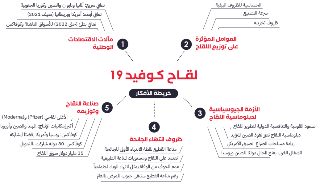 – تبرز مبادرة “كوفاكس” لتوزيع اللقاحات باعتبارها من أكثر المبادرات شمولاً، ويمكن أن تمثل إطاراً لتسهيل عملية التوزيع، ولكن دورها سيكون محدوداً في تخفيف حدة التنافس الجيوسياسي على اعتبار أن بعض الاقتصادات الكبرى (ومنها روسيا والولايات المتحدة) رفضت المشاركة فيها.