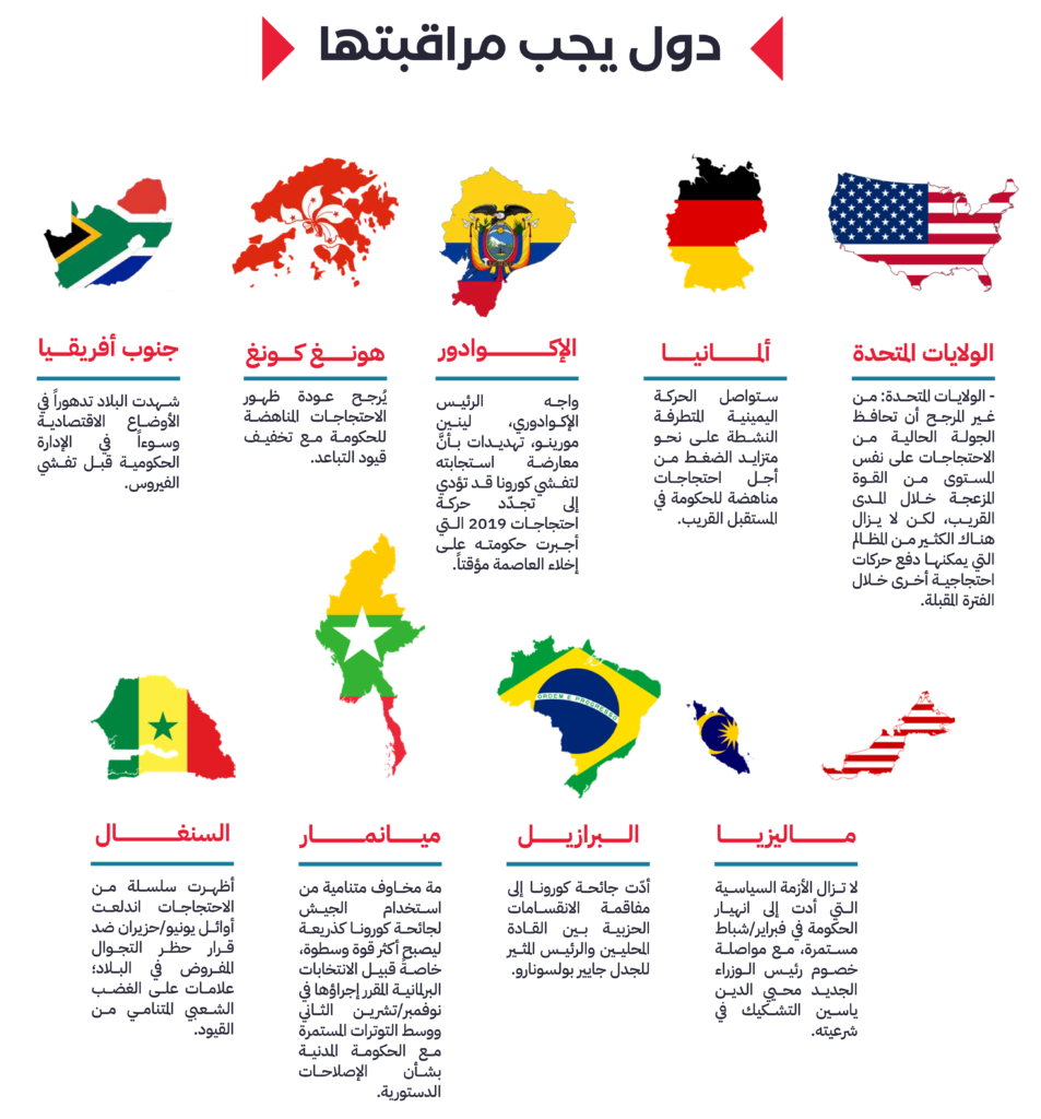 • وعلى الصعيد المحلي لدول المنطقة، فإن تصاعد مخاطر الاحتجاج الداخلي واحتمالية اندلاع مواجهات شعبية وسياسية واسعة خلال العام 2021 أمرٌ ما زال مرجّح في عدة دول عربية، لعل أبرزها العراق ولبنان. كما أن “إسرائيل” التي واجهت اضطرابًا سياسيًا، وأجرت ثلاثة انتخابات في أقل من عام نتج عنها حكومات ضعيفة واحتجاجات شعبية غير مسبوقة، تتجه الأنظار بشأنها لانتخابات رابعة خلال الفترة المقبلة، غير مضمونة النتائج في جلب الاستقرار.