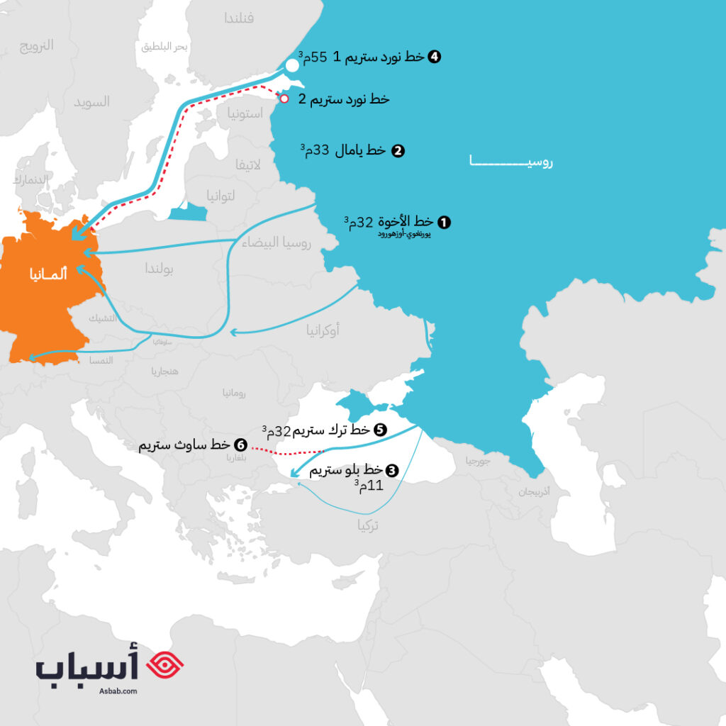 • تم إطلاق خط أنابيب نورد ستريم 2 (Nord Stream 2) في عام 2015، ويربط روسيا وألمانيا مباشرة عبر بحر البلطيق، باتباع طريق مماثل لنورد ستريم 1 الذي اكتمل في عام 2011. في مطلع يونيو/حزيران الماضي، أكملت روسيا بناء خط الأنابيب الأول من خطي مشروع نورد ستريم 2 إلى ألمانيا. بينما يتبقى أقل من 80 كم (50 ميلًا) من الأنبوب الثاني لم يتم وضعها بعد – وهي مهمة تستغرق شهرين فقط، على افتراض أن الطقس جيد في بحر البلطيق وأن الولايات المتحدة ستتراجع عن فرض عقوبات تستهدف إعاقة المشروع.